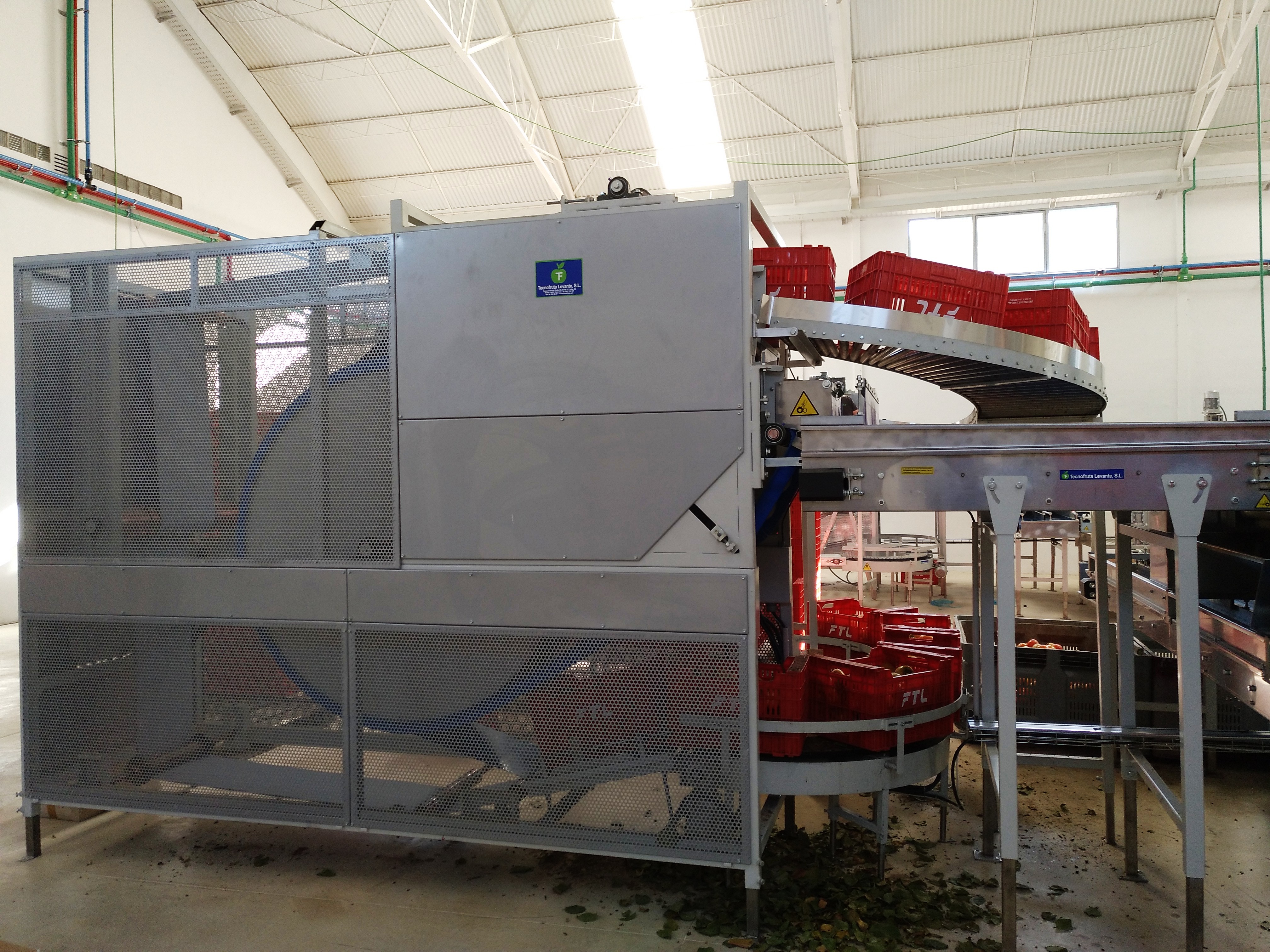 Field boxes are overturned and the product is directed to the next phase of the process. The box arrives, normally through a chain conveyor, to the input rollers of the dump and is caught between the two belts and flipped for unloading, leaving the product and being deposited in the next machine of the line. The box is expelled by a higher level and slides down a ramp to a comfortable height to be collected. The speed is adjustable according to the line of work.